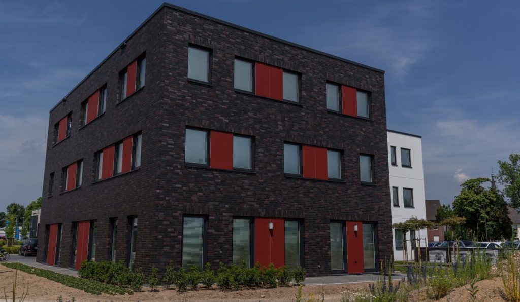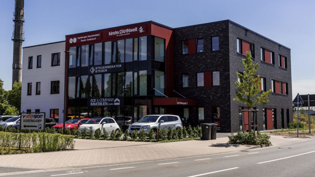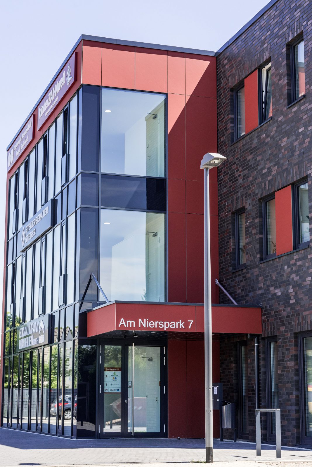 Realisiert wurde ein 3-geschossiges Bürogebäude mit einer Ergotherapie- und Zahnarztpraxis sowie zwei Büroetagen, jeweils mit ca. 400 m² Nutzfläche. Weiterhin wurden auf ca. 1.000 m² befestigter Fläche 45 Stellplätze angelegt. Nierspark Geldern Rückansicht